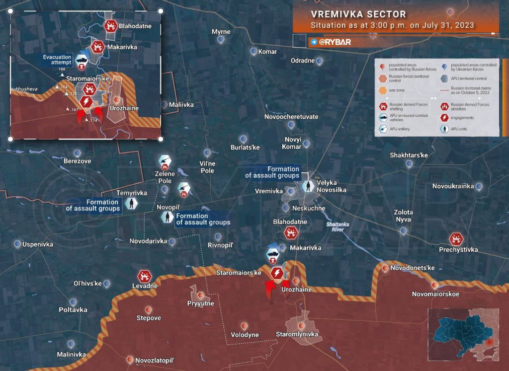 Sul fronte di Zaporizhia, nel settore del cosiddetto Saliente di Vremevsky, dove le linee russe si incuneano nel territorio controllato dagli ucraini, i russi avrebbero riconquistato il 30 luglio nel corso di un contrattacco condotto dalle truppe aviotrasportate il villaggio di Staromayorsk, la cui conquista è stata annunciata il 27 luglio dal presidente ucraino Volodymyr Zelensky.