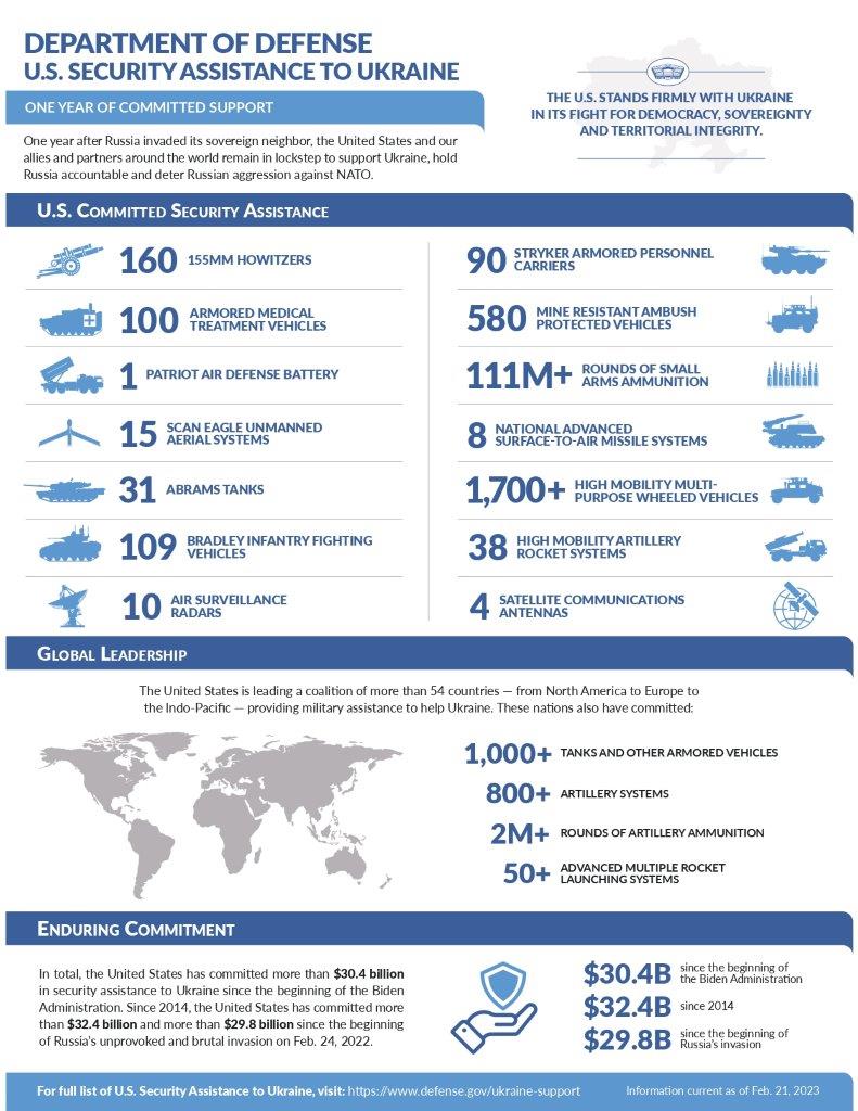 Il 25 luglio il Dipartimento della Difesa (DoD) statunitense ha annunciato un ulteriore pacchetto di aiuti militari per l’Ucraina valutato fino a 400 milioni di dollari e che include ulteriori munizioni per la difesa aerea, artiglieria e altre munizioni, veicoli corazzati, armi anticarro e altre attrezzature (n ella grafica sotto una tabella riassuntiva degli aiuti militari forniti finora da Washington a Kiev..