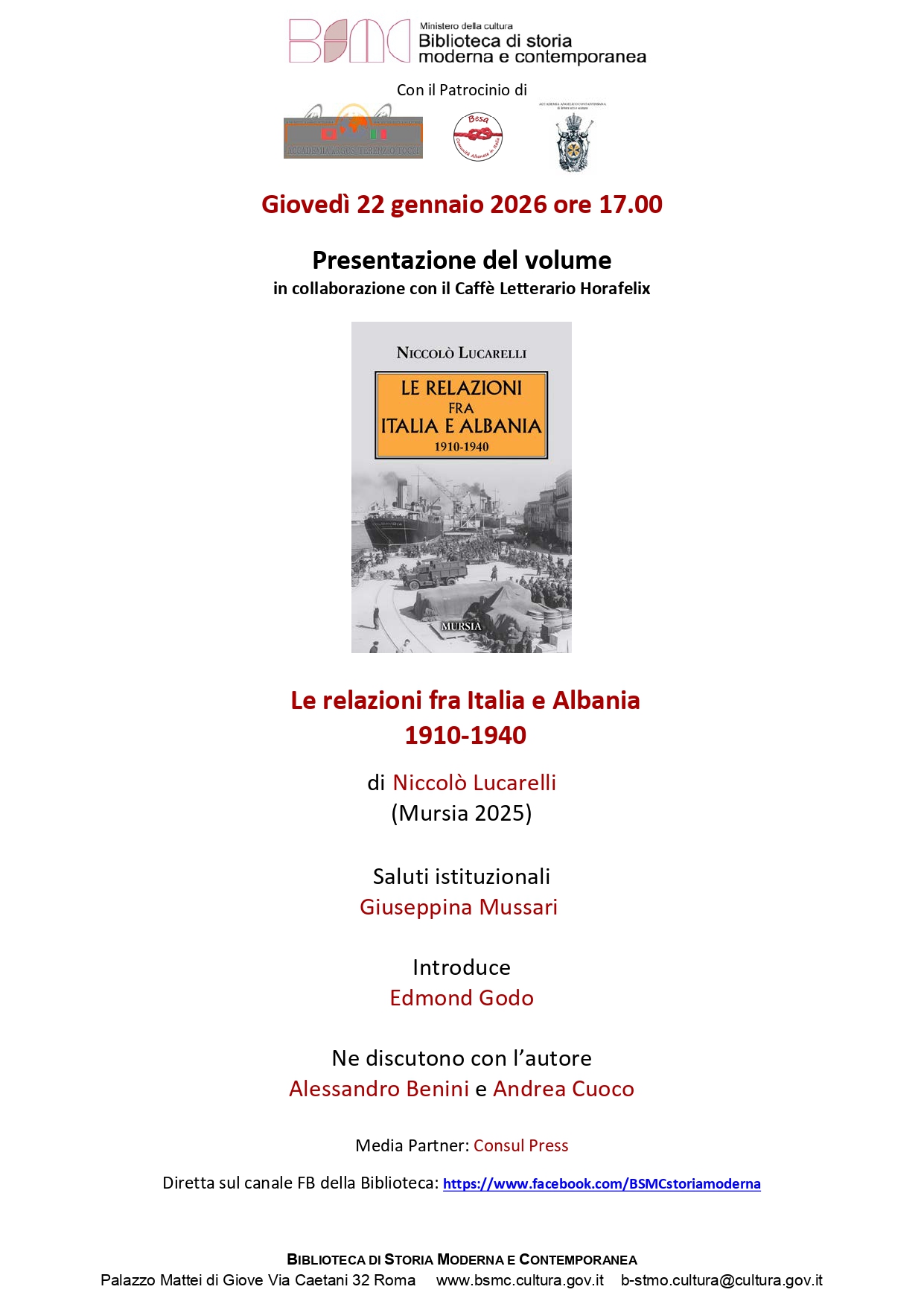 Per ripercorrere quei trent’anni di storia, giovedì 22 gennaio alle ore 17, la Biblioteca di storia moderna e contemporanea, in via Caetani 32, ospita la presentazione del volume Le relazioni fra Italia e Albania 1910-1940, dello storico militare pratese Niccolò Lucarelli, uscito per i tipi di Mursia. L’evento, in collaborazione con il Caffè Letterario Horafelix, è patrocinato dall’Accademia Angelico Costantiniana di Lettere Arti e Scienze, dall’Accademia Terenzio Tocci e dalla Comunità Albanese BESA; la testata Consul Press è invece il media partner dell’evento.