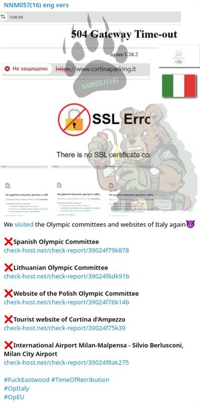 Fra le attività malevole effettivamente rilevate spiccano le campagne DDoS di matrice filorussa, rivendicate da gruppi noti come il collettivo hacktivista NoName057(16). Nello specifico, questo avversario ha rivendicato offensive contro i Comitati olimpici di Spagna, Lituania, Polonia, Austria e Finlandia. In Italia ha mirato contro infrastrutture ricettive dei Giochi, mentre in altri Paesi ha colpito anche realtà che non avevano specifiche connessioni con essi.