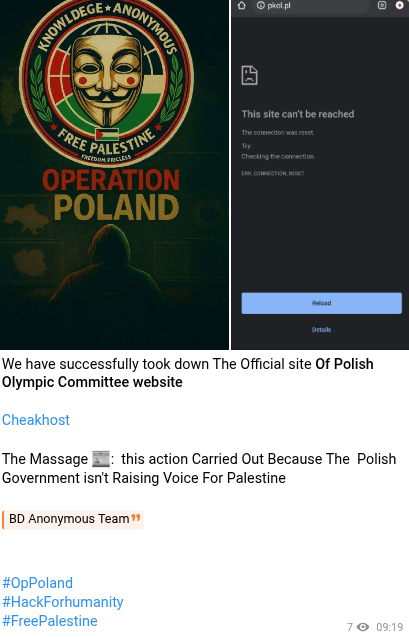 Fra gli altri episodi più espliciti, il collettivo BD Anonymous, di presunta matrice sud-asiatica/bengalese, ha rivendicato il DDoS contro il Comitato Olimpico Polacco. Il messaggio veicolato in quell’occasione mirava ad attirare l’attenzione sulla questione palestinese.