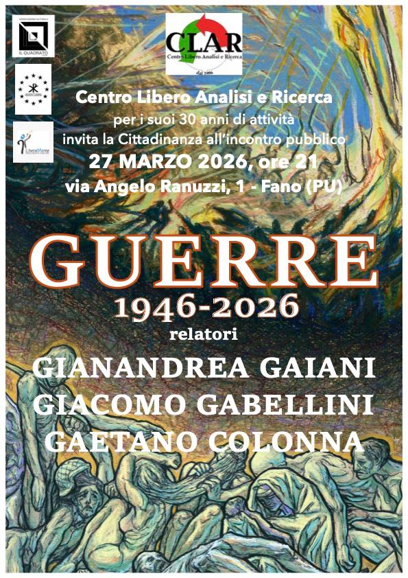 Invitiamo quindi tutti coloro che sono interessati ad essere presenti il prossimo 27 marzo, ore 21, in via Ranuzzi 1 a Fano, all’incontro pubblico intitolato GUERRE 1946-2026, che CLAR organizza per parlare appunto del tema che più si impone oggi alle nostre coscienze.