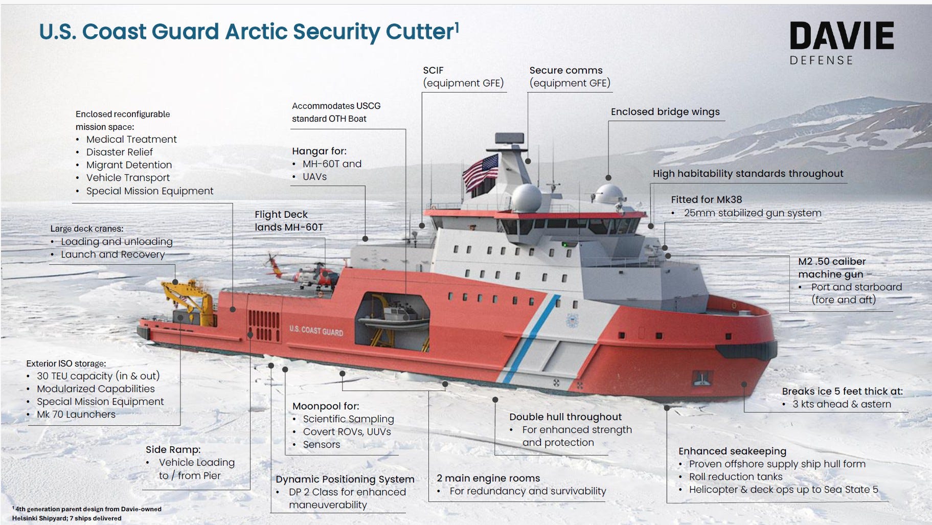 Naval News ha aggiunto un ulteriore dettaglio che spiega in parte la ragione per cui sarà possibile realizzare le unità navali per la US Coast Guard in tempi così contenuti: l’Arctic Security Cutter non è un progetto esclusivo di Davie Defense, ma un progetto collaudato con sette unità già in servizio in tutto il mondo (anche se nessuna nella flotta della Guardia Costiera statunitense al 2025). Davie Defense offre questo progetto di rompighiaccio di quarta generazione in collaborazione con la sua controllata finlandese, Helsinki Shipyard.